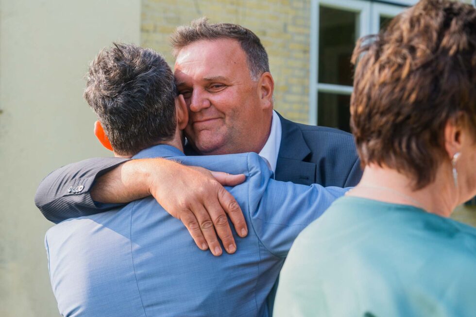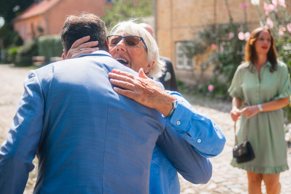 Mit jeder Umarmung wurde das Lächeln breiter, bevor sich die beiden von ihren Gästen kurz verabschiedeten, um sich für das große Ereignis am Nachmittag – die kirchliche Trauung – fertig zu machen.