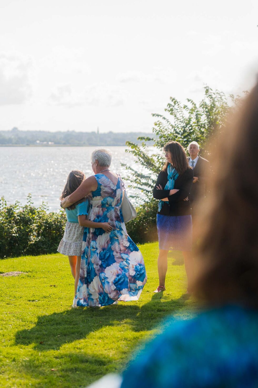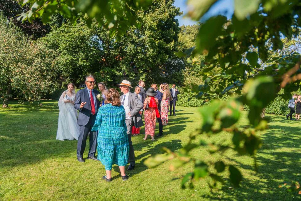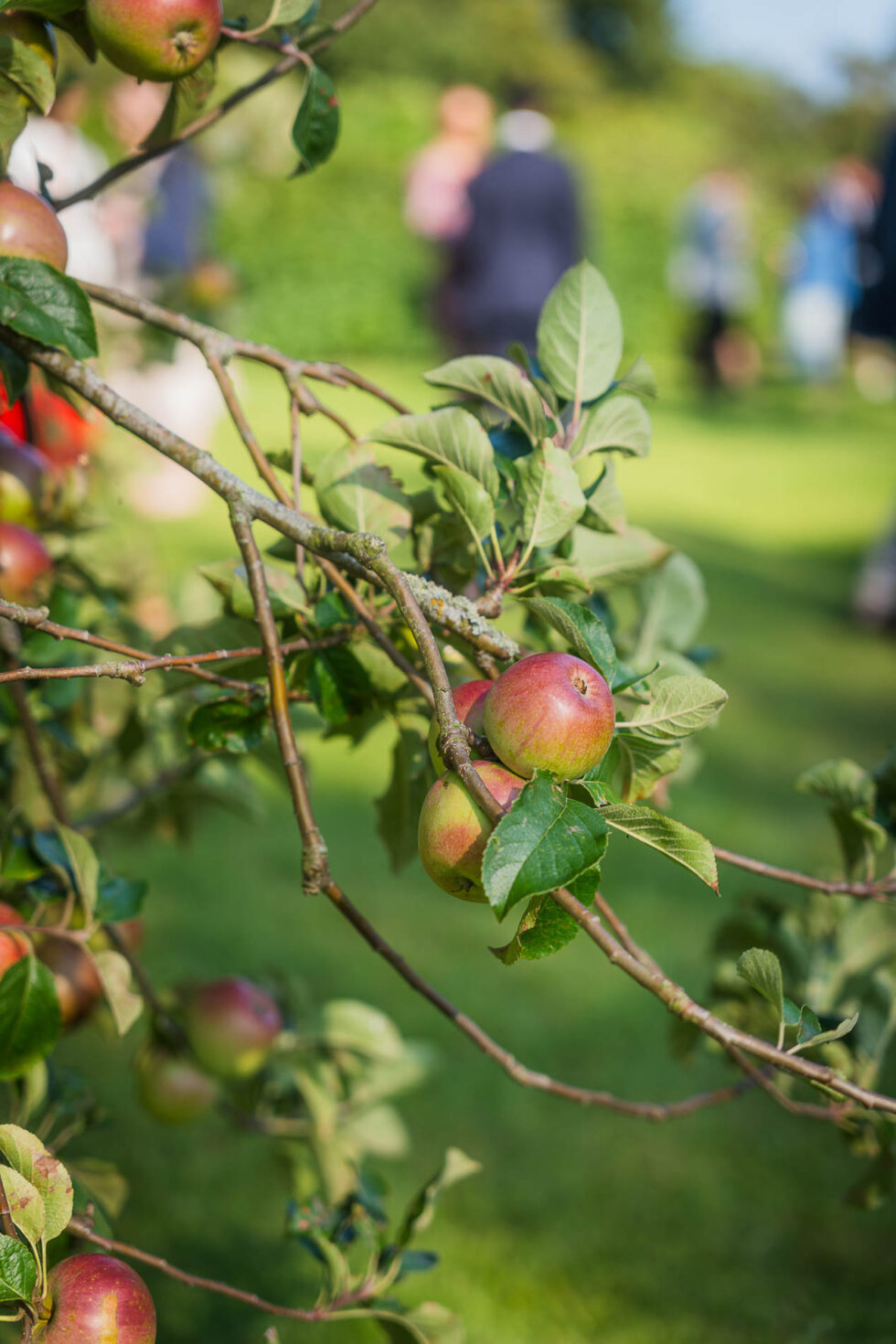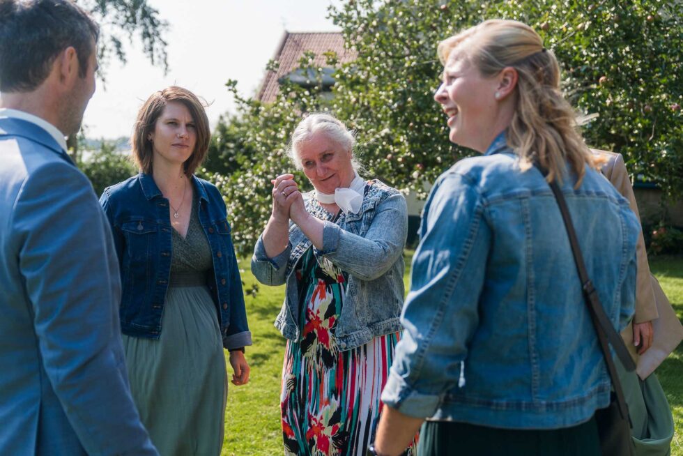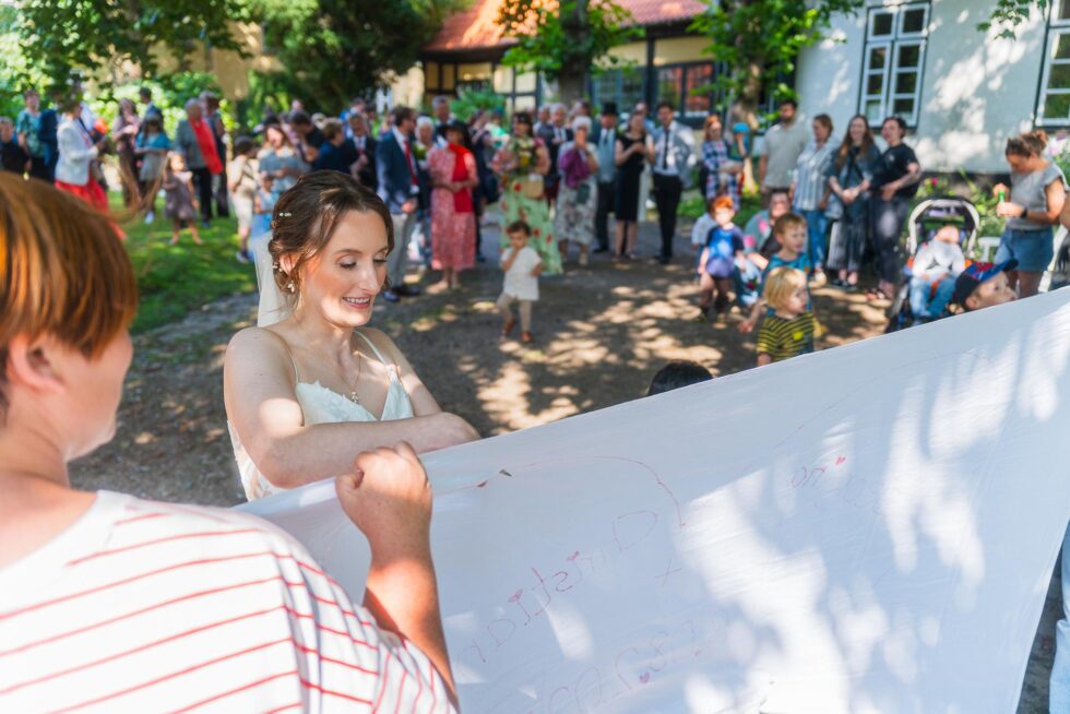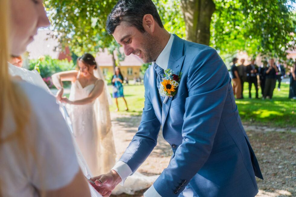 Nach der kirchlichen Trauung sind Georgina & Christian voraus zum Klostergarten gelaufen – ein himmlischen Stückchen Erde, auf dem sie ihre Glückwünsche entgegengenommen und das traditionelle Laken zerschnitten haben. Eine saftig grüne Wiese voller Obstbäume, abfallend zum Wasser und einem weiten Blick bis zu den Hügeln in der Ferne. Dazu Sonnenschein satt, die ein oder andere steife Brise, wie sie bei uns im Norden üblich ist und lecker Fingerfood und Getränke – so kann man es sich gut gehen lassen!