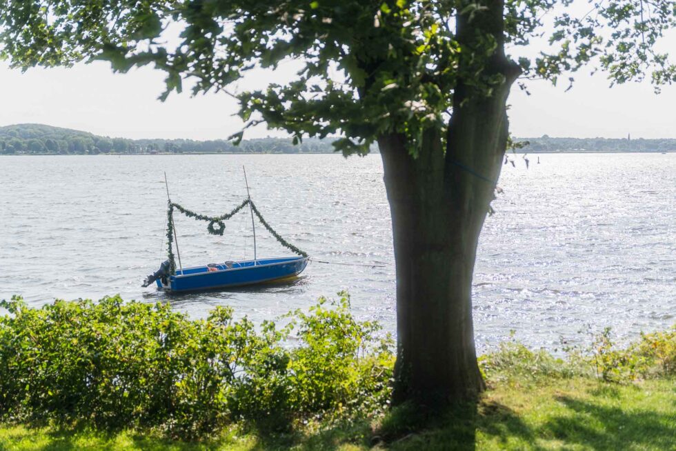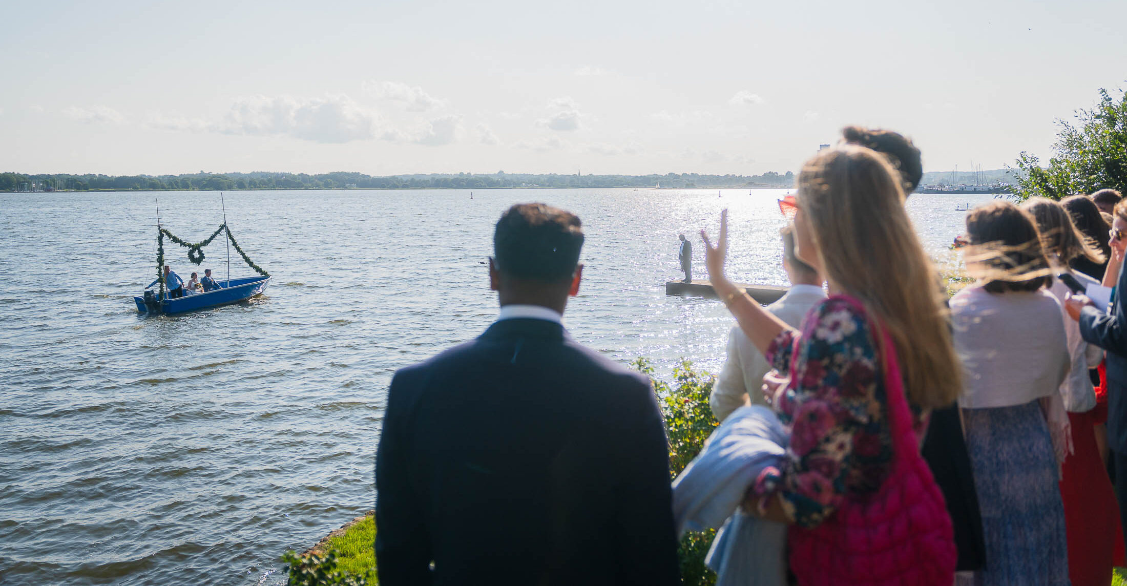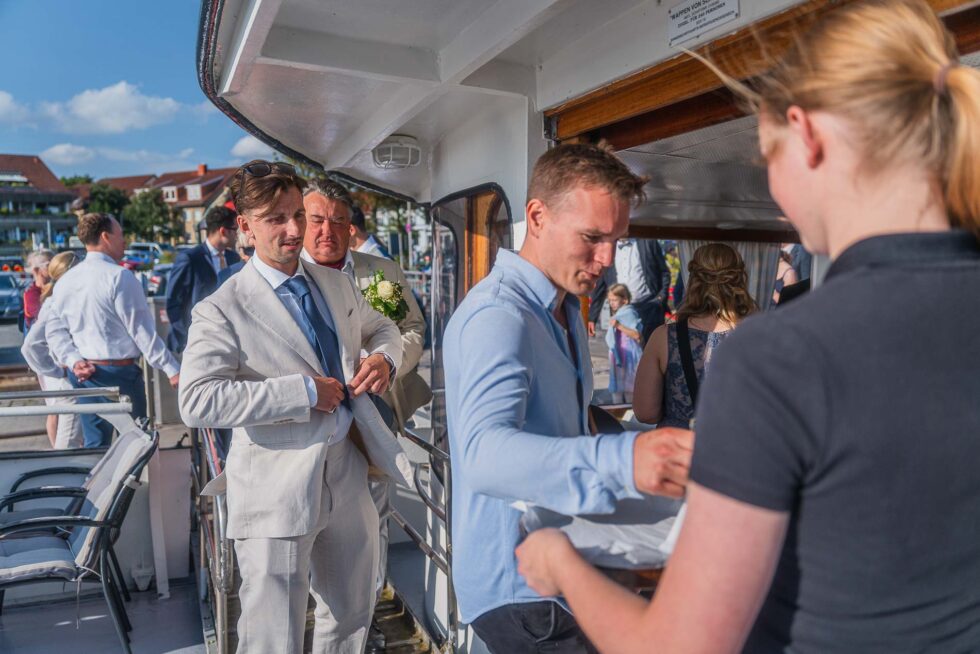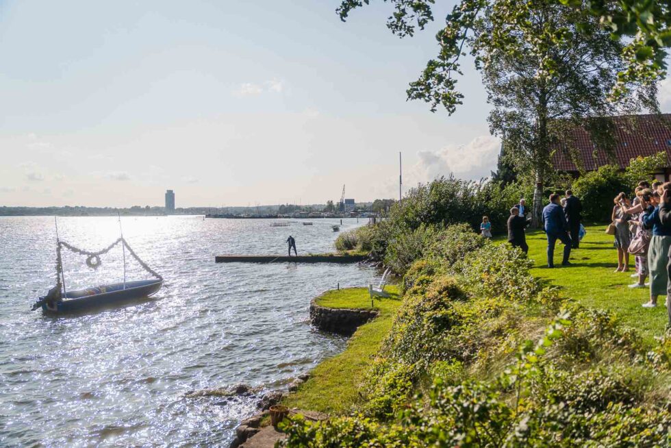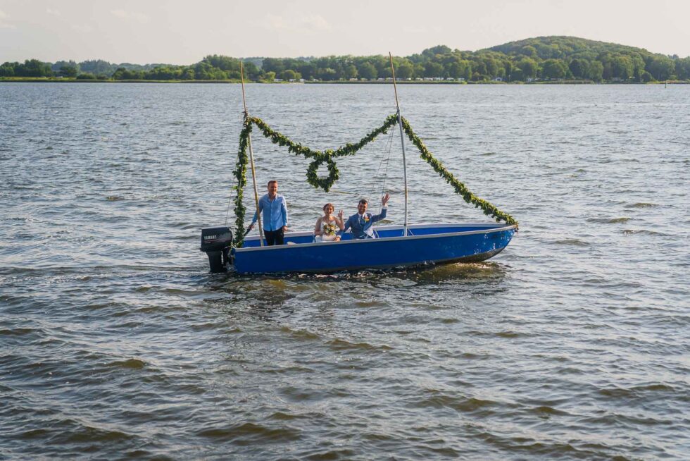 Und wenn der Bräutigam Fischer ist, bekommt er natürlich von seinen Kollegen und Freunden eine ganz besondere Überraschung: Mit dem kleinen privaten Boot schipperten die beiden über die Schlei zur letzten Location des Tages: der „Wappen von Schleswig“ – einem Schiff, mit dem schon Christians Opa an der Schlei entlang gefahren ist. Eine besondere Verbindung für die Beiden und eine wundervolle Gelegenheit, um den Gästen bei einer kleinen Rundfahrt die einmalige Umgebung zu zeigen!