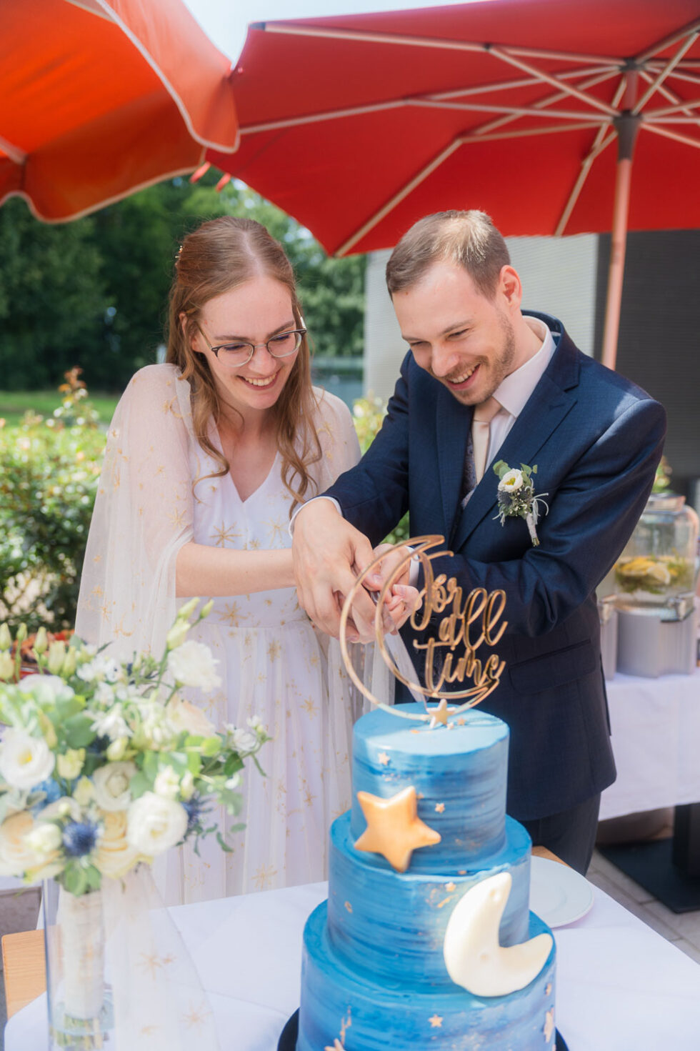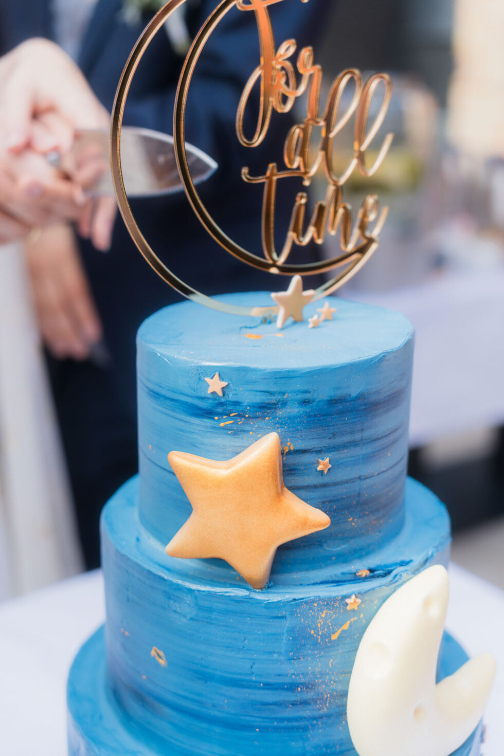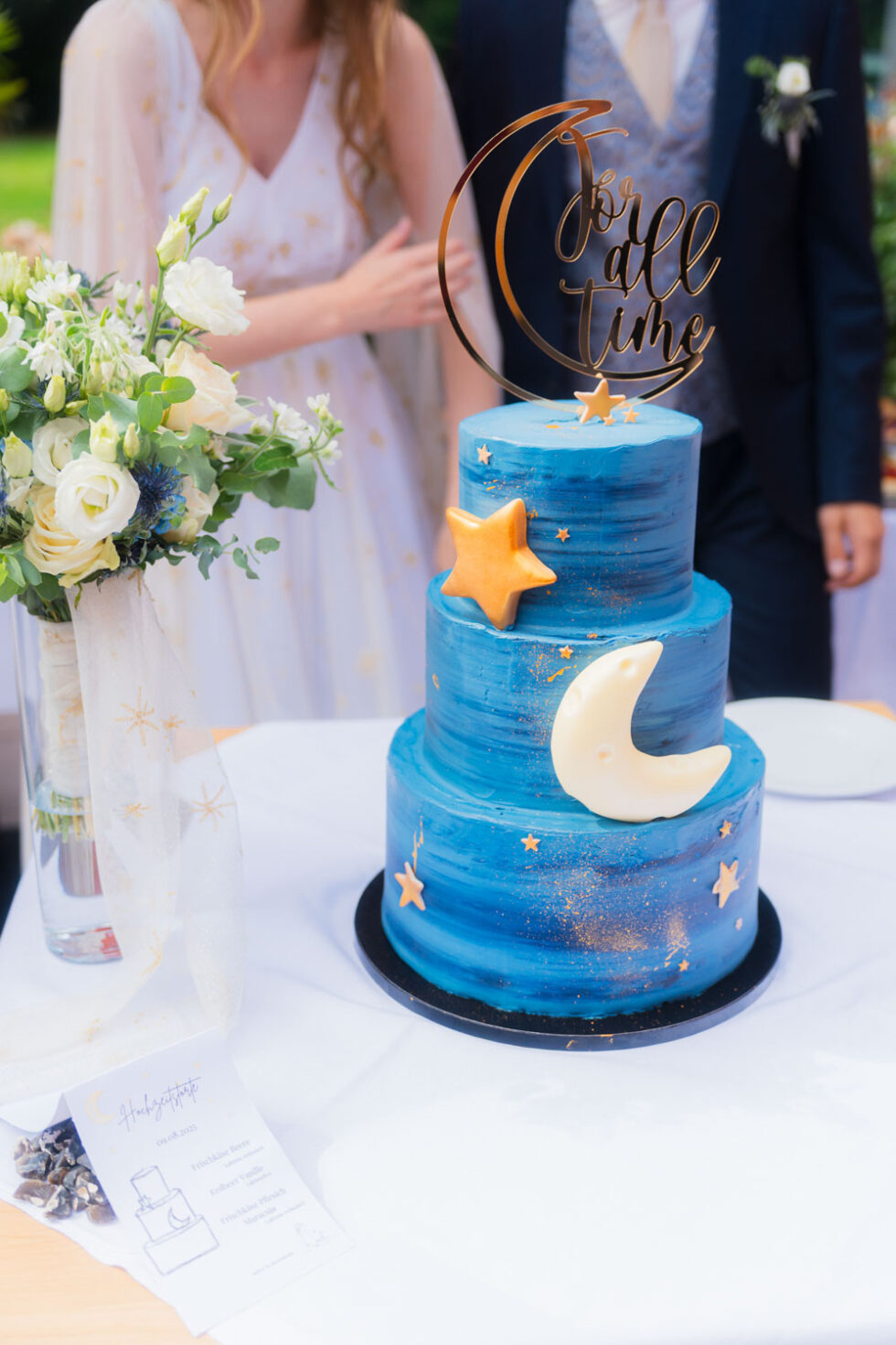 „Blau & Sterne“ war das Motto der Hochzeit von Lucy & Jan – und so war auch die Hochzeitstorte ein absoluter Traum in Blau! Ja, alles essbar natürlich, aber Achtung: das Risiko einer blauen Zunge ist auch mit dabei!