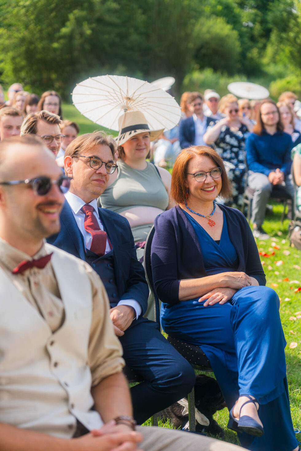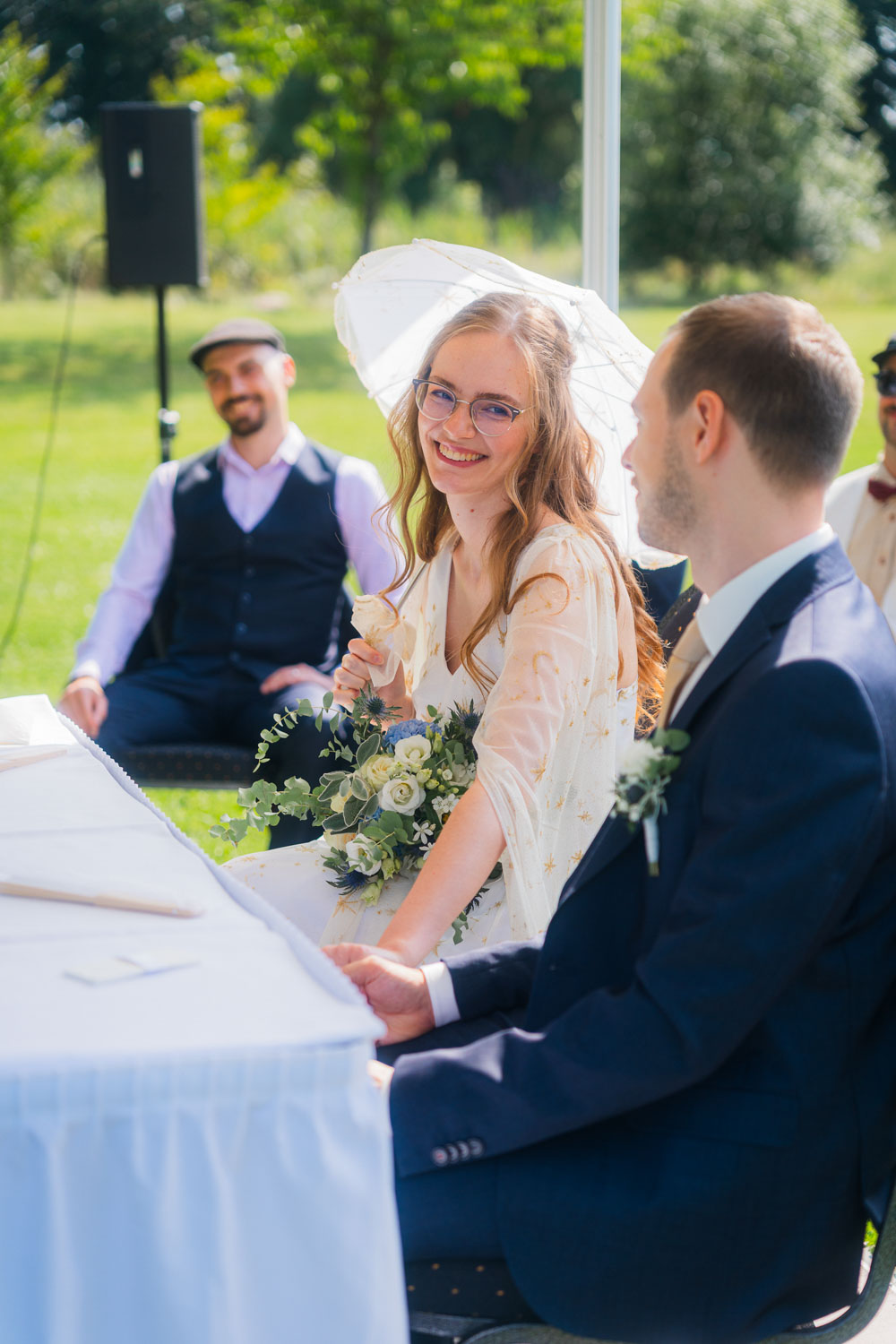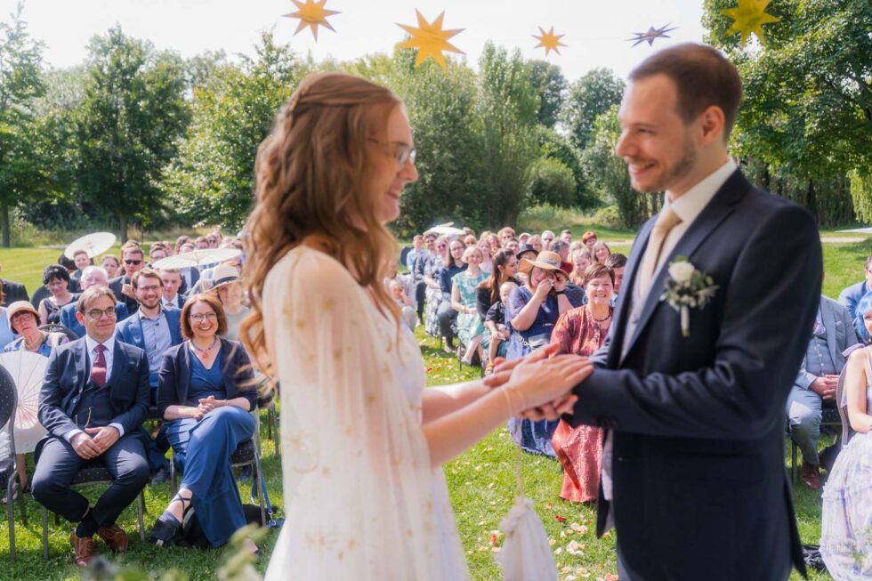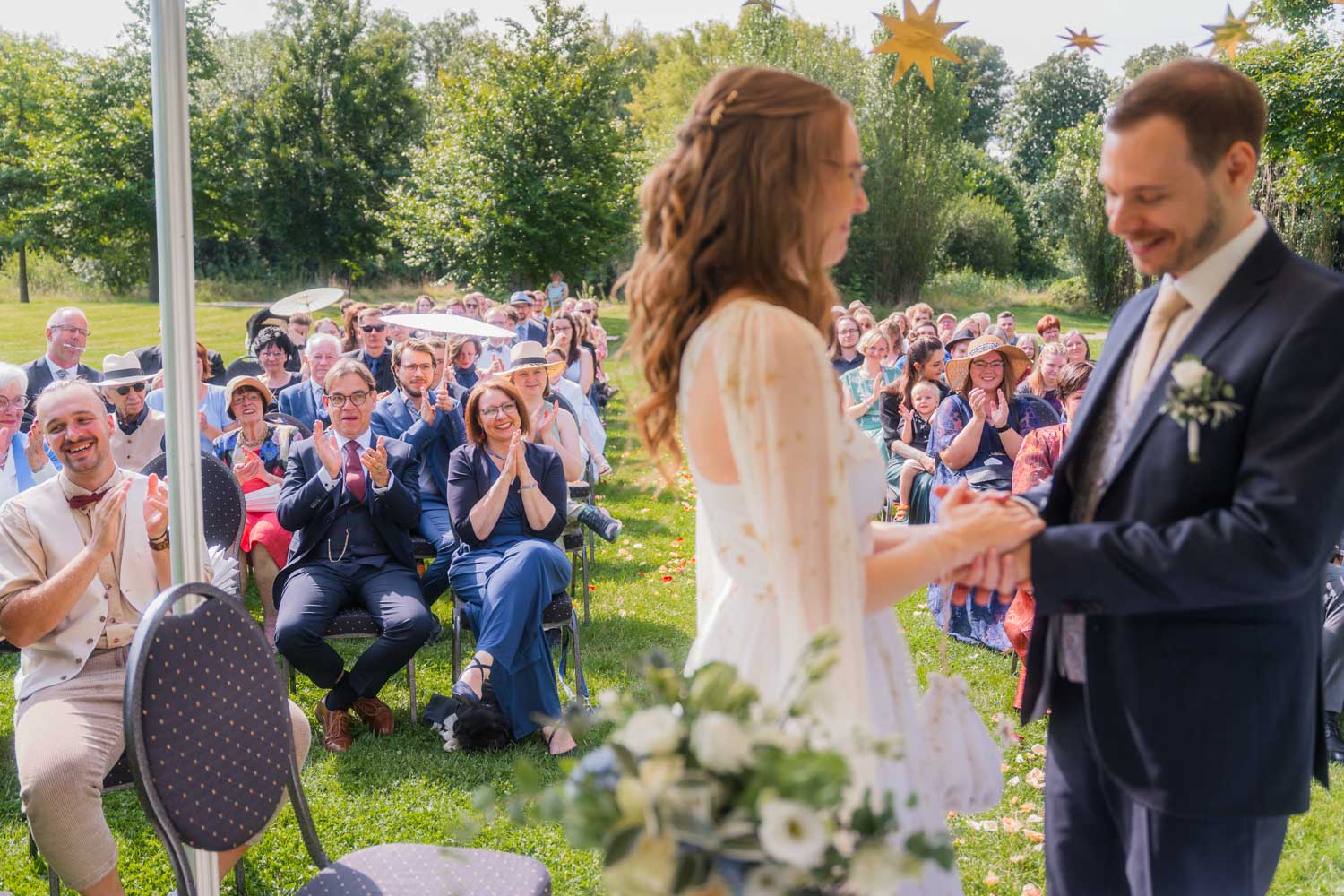 Die freie Trauung fand auf der Wiese direkt am Wasser statt – umgeben von Natur und begleitet von einer unglaublich entspannten Atmosphäre.