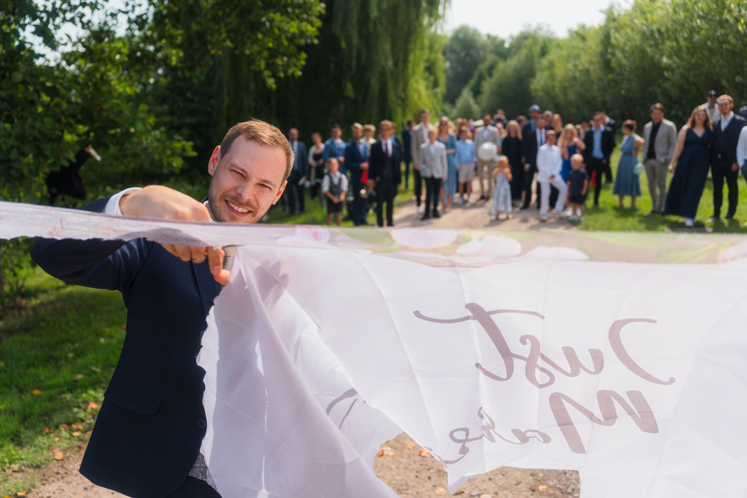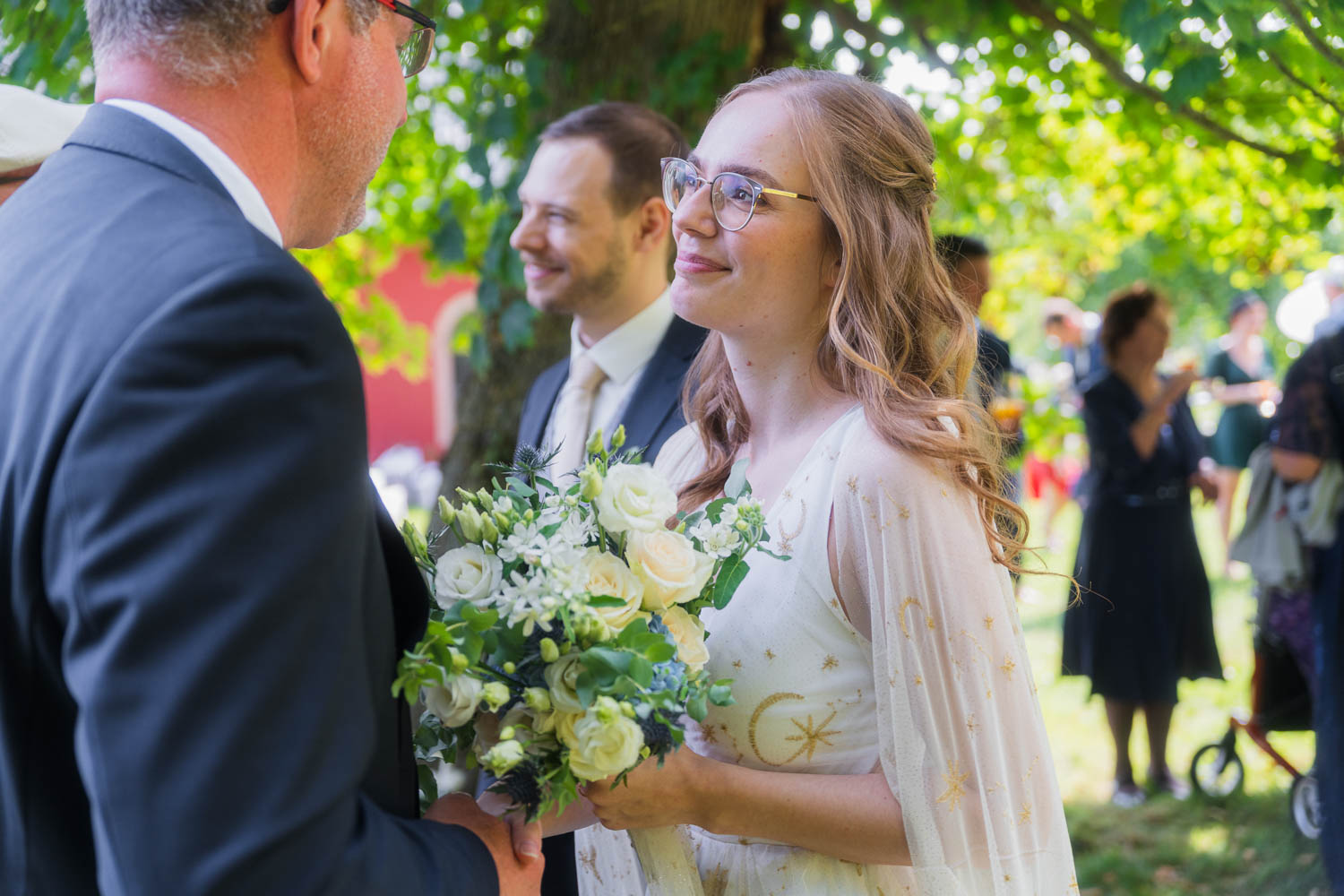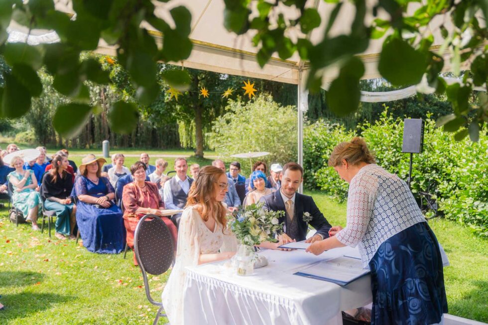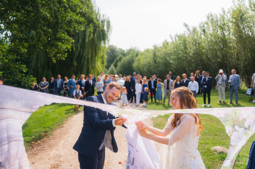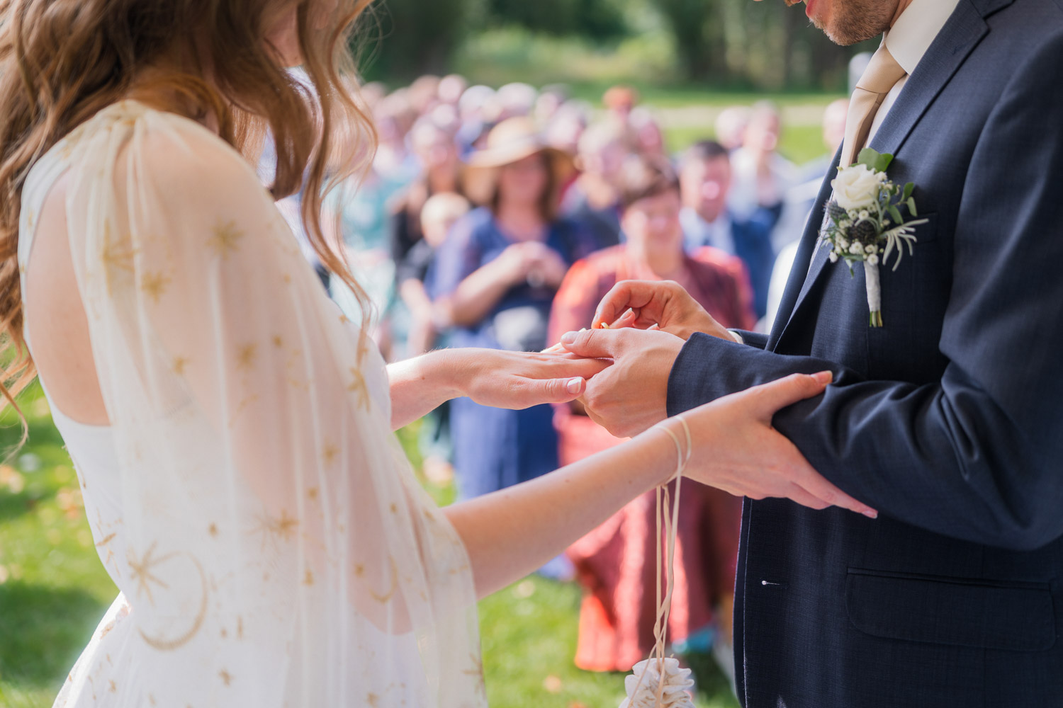 Die freie Trauung fand auf der Wiese direkt am Wasser statt – umgeben von Natur und begleitet von einer unglaublich entspannten Atmosphäre.