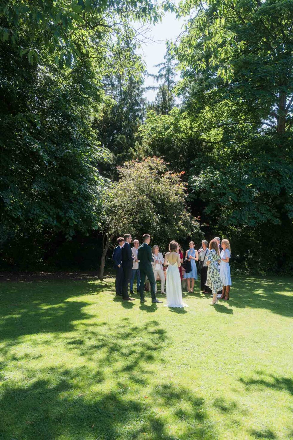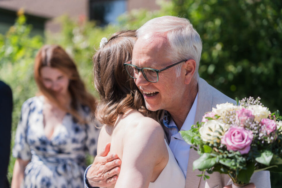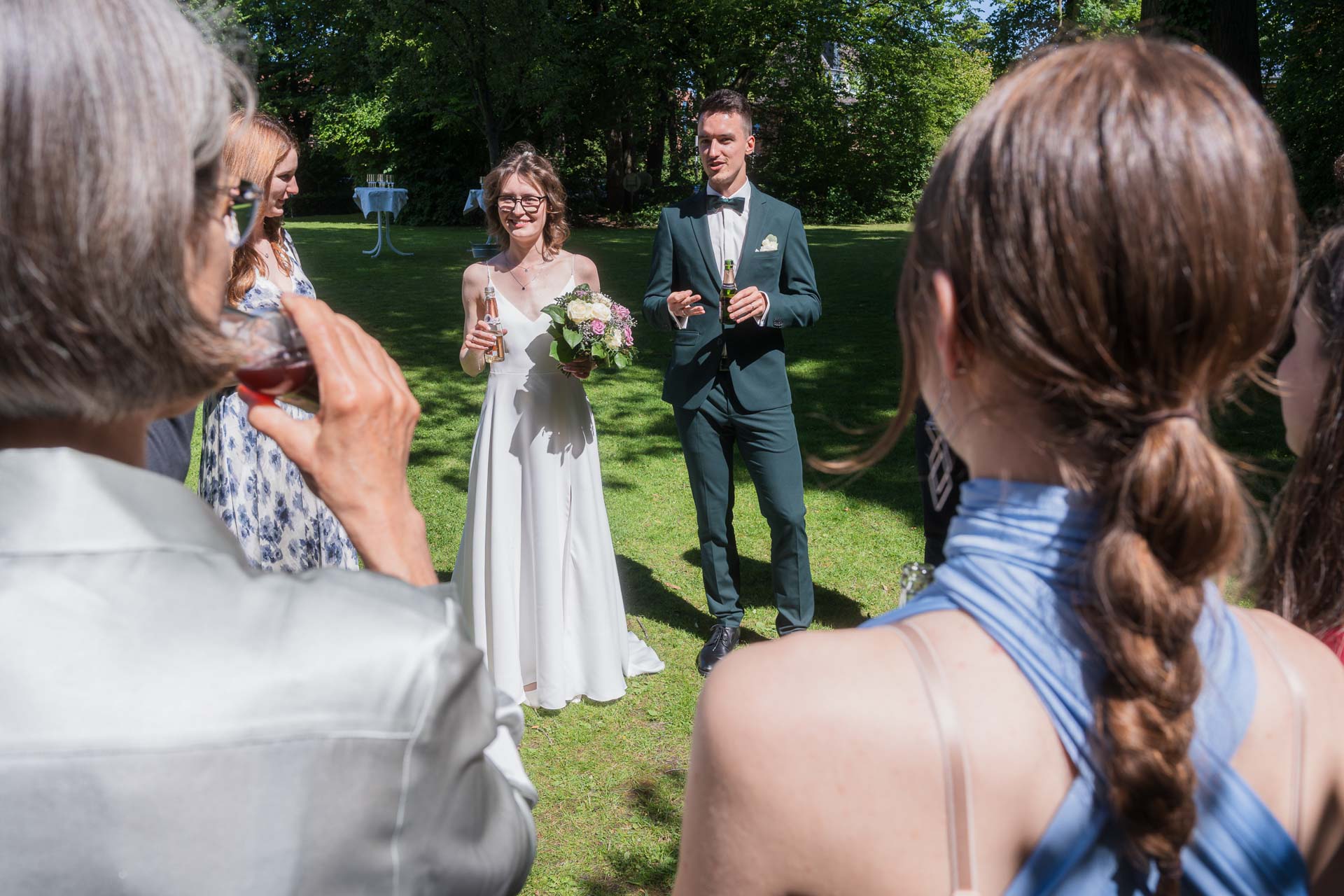 Nach der Trauung ging es hinaus in den Garten. Und plötzlich war alles anders: lauter, lebendiger, voller Bewegung. Jubel, Applaus, Umarmungen. Die Gäste standen bereit, Gläser wurden gefüllt und der erste Sekt wurde gemeinsam getrunken.