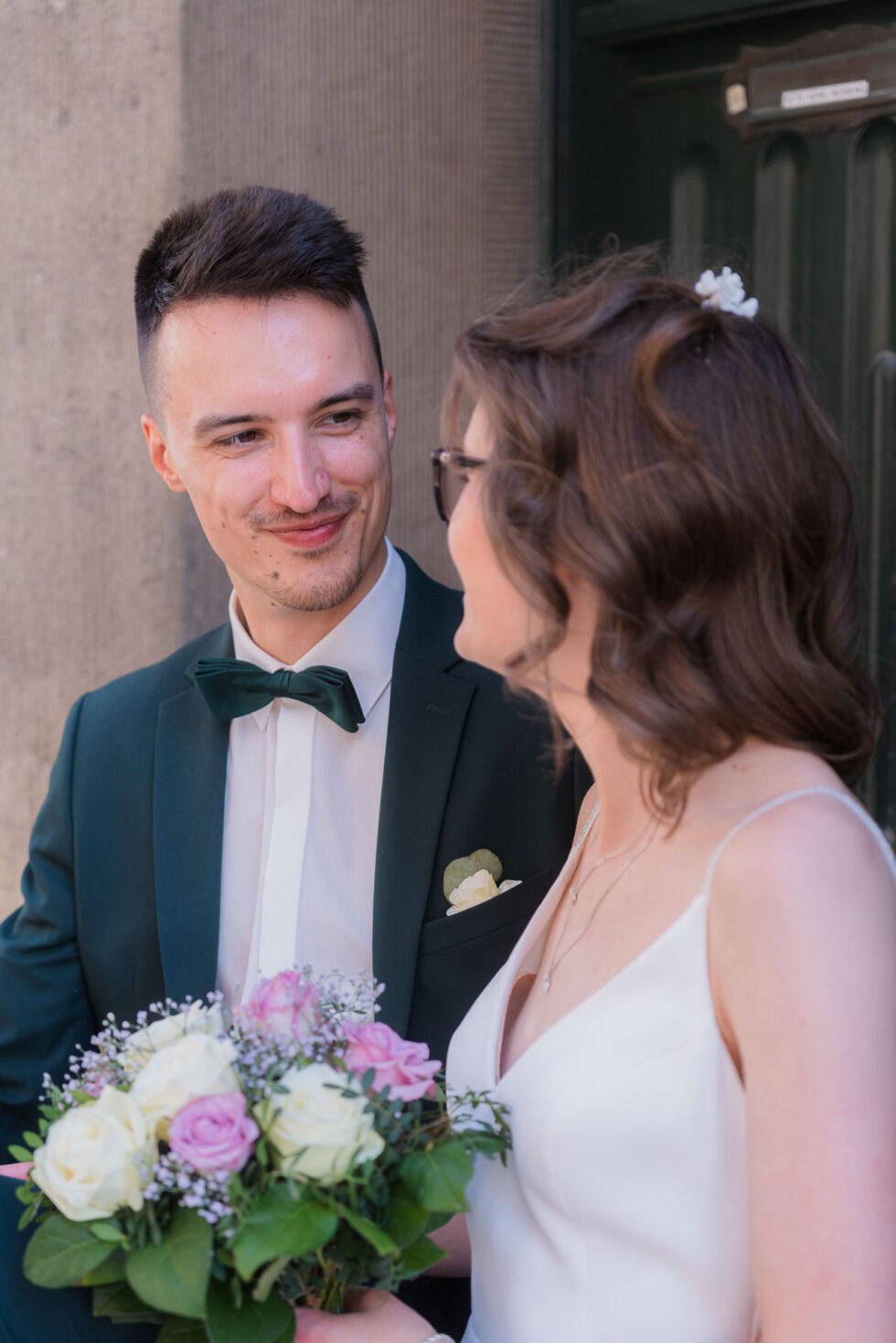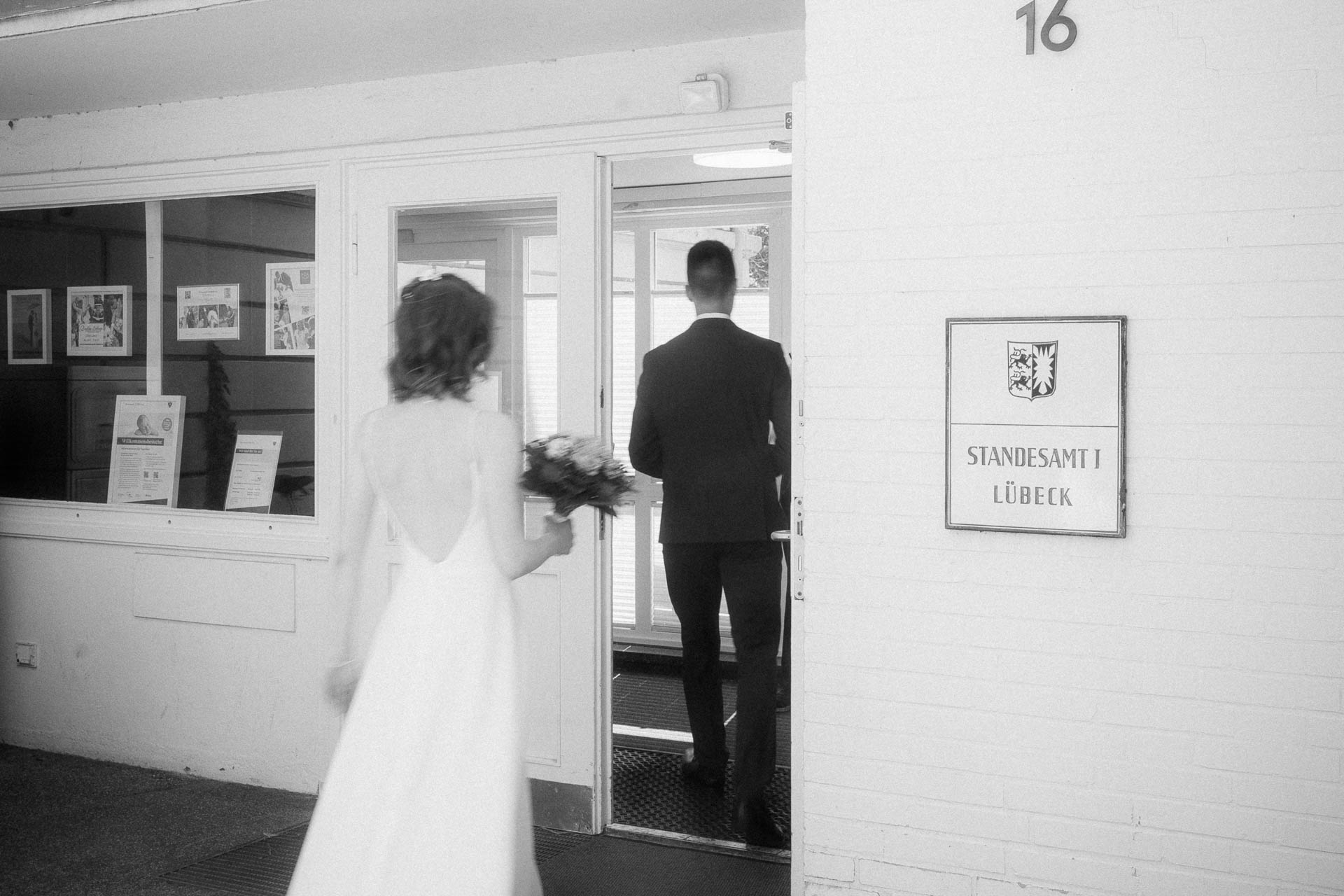 Vor dem Standesamt in Lübeck sammelten sich nach und nach ihre Liebsten. Keine große Inszenierung, kein Trubel – sondern genau die Art von Anfang, die sich ehrlich anfühlt. Gespräche, Umarmungen, dieses leise Knistern in der Luft.